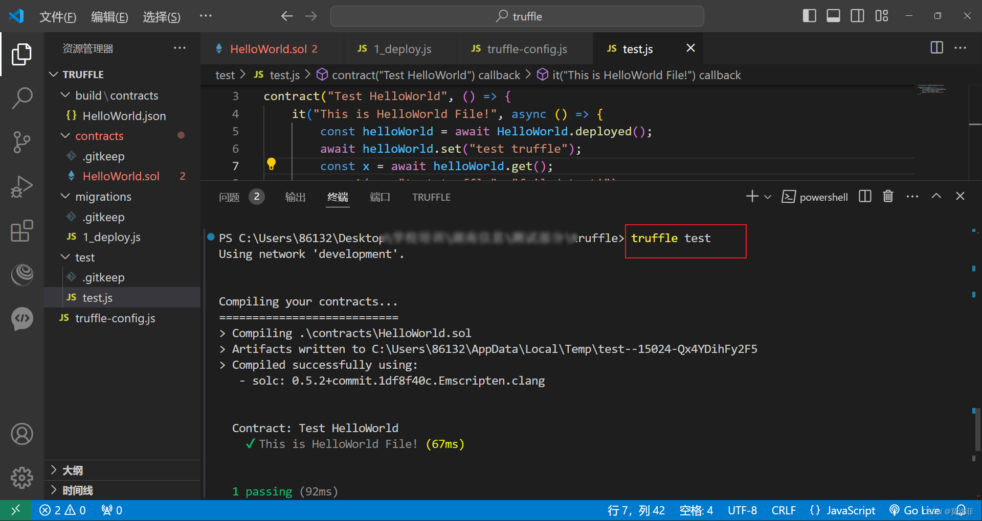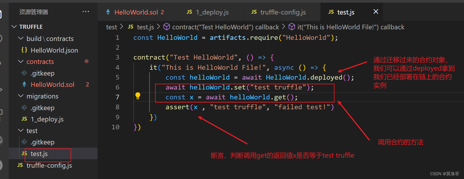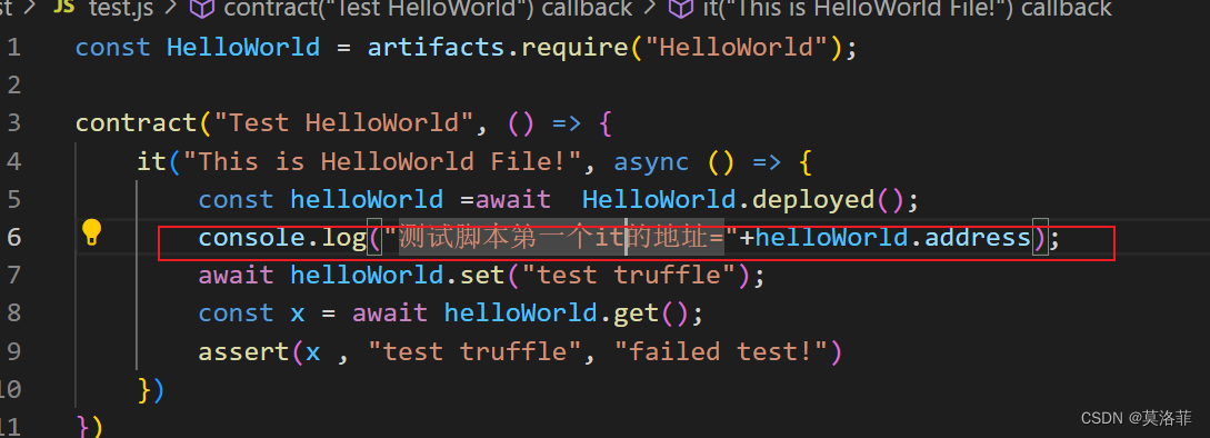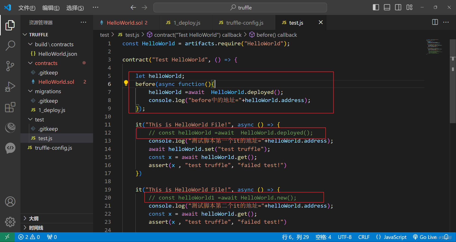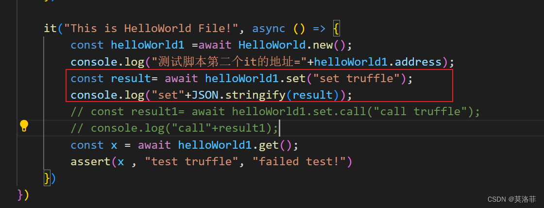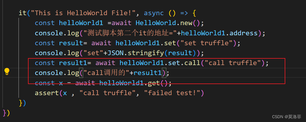 我们定义一个let 变量,然后通过before来在所有的it测试之间将合约拉下来,保存到helloWorld变量中,后续的it测试就直接使用这个实例