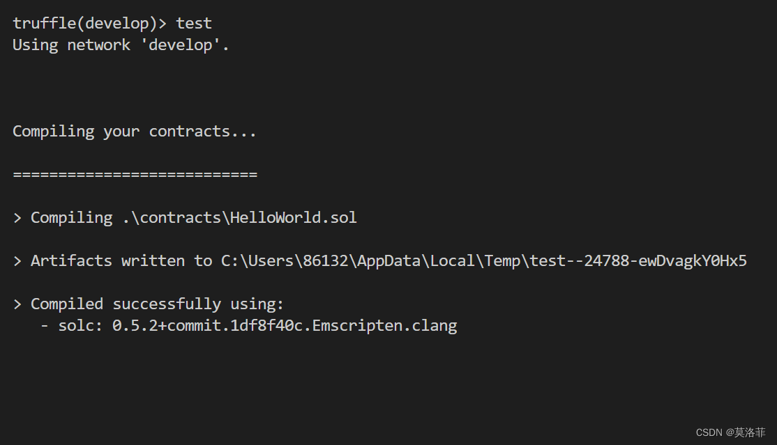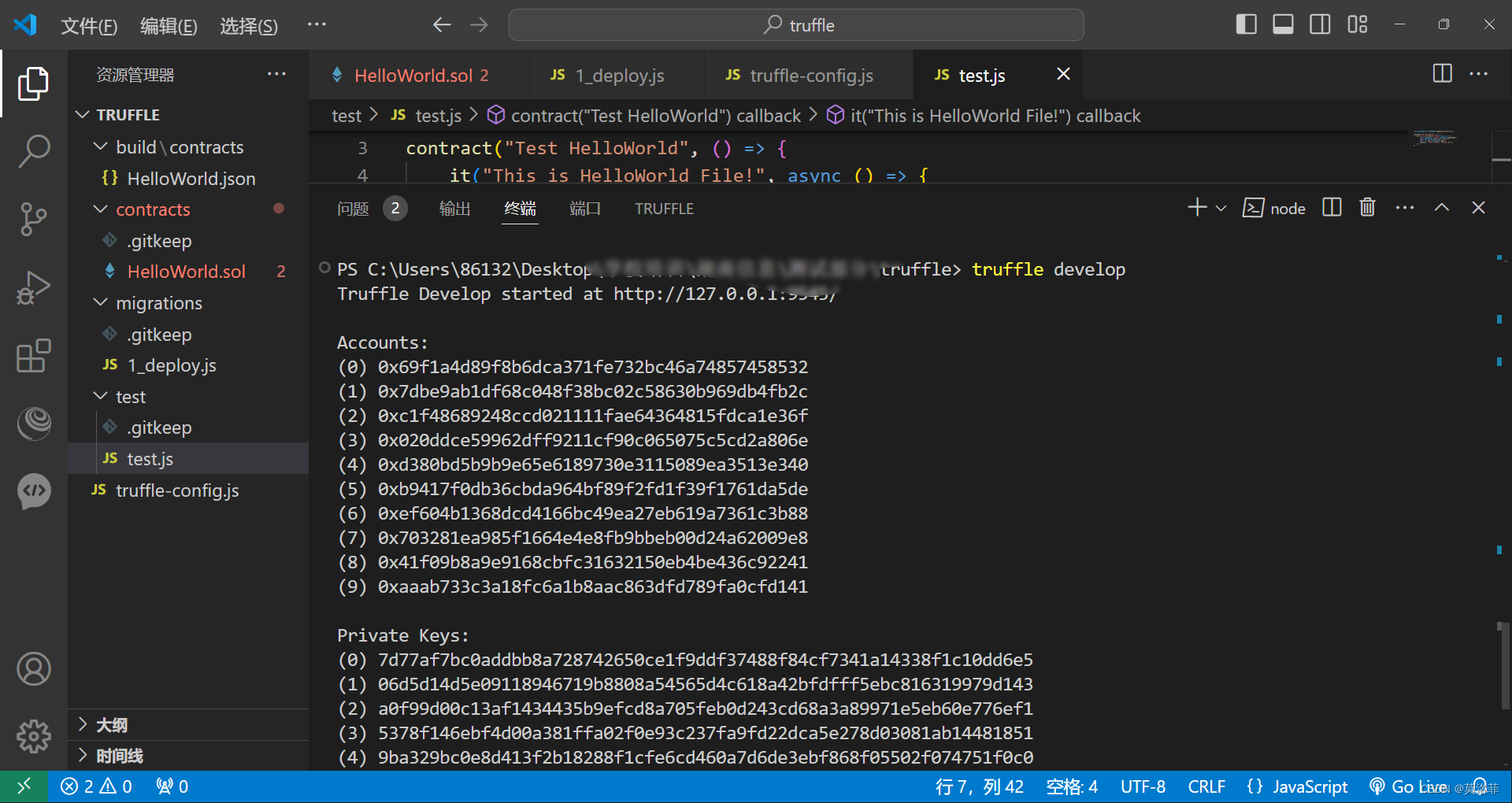 区别与上文编辑连接配置,直接 控制台输入 truffle develop ,会进入truffle 控制台。