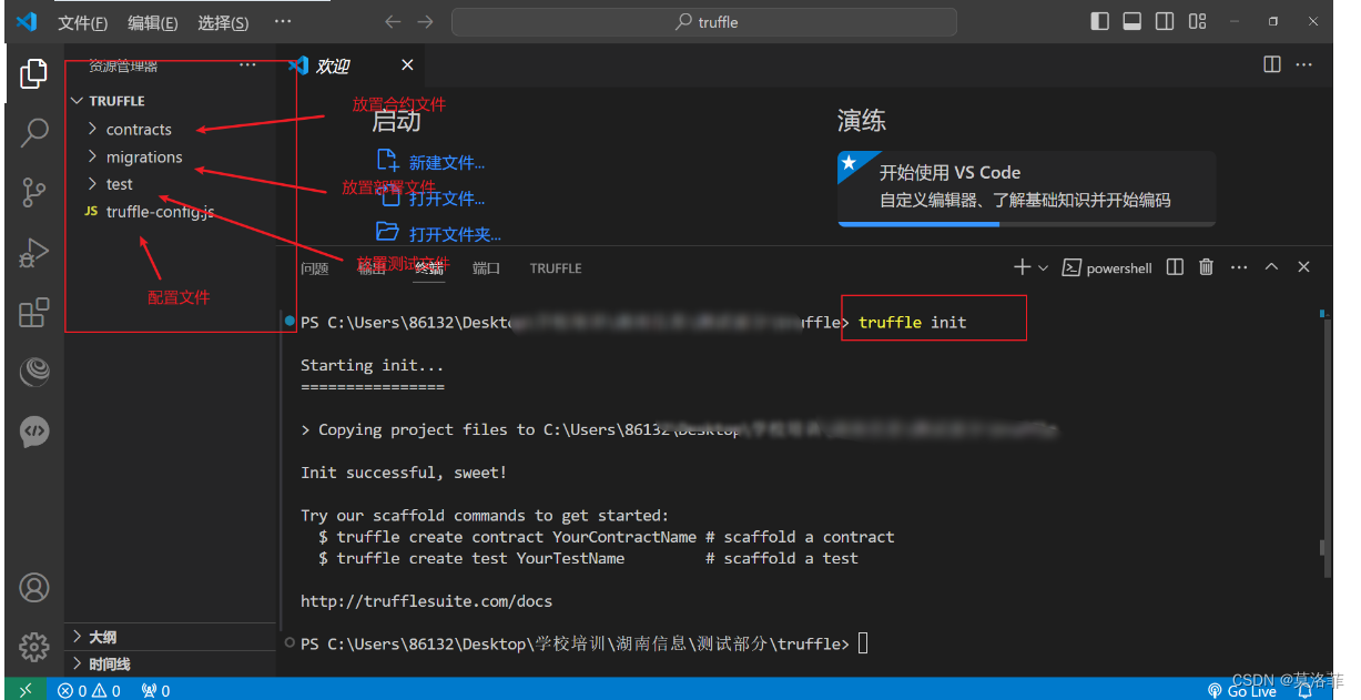 在truffle 控制台执行compile ,migrate 、test命令 会跟上文有同样的效果。