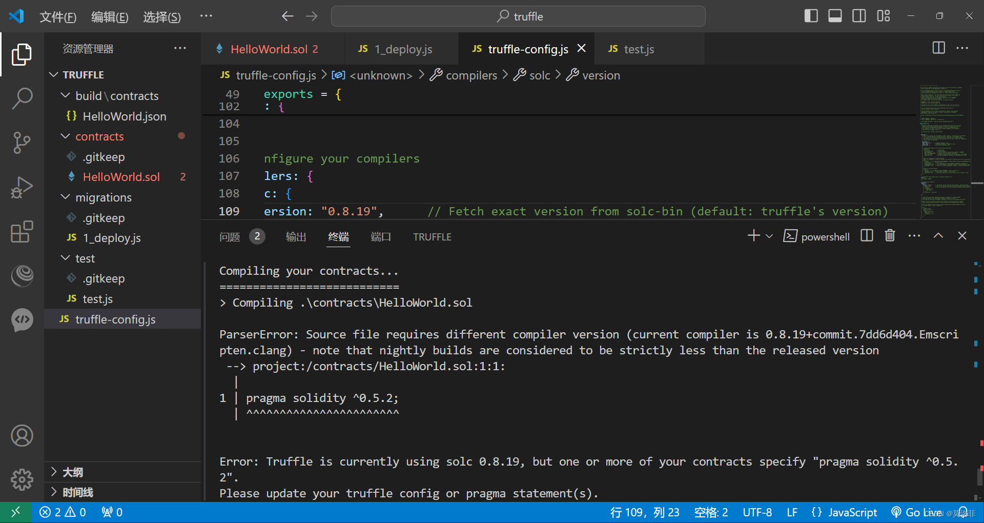 2.你truffle 配置文件的编译器版本和你测试合约要求编译器版本不适应。