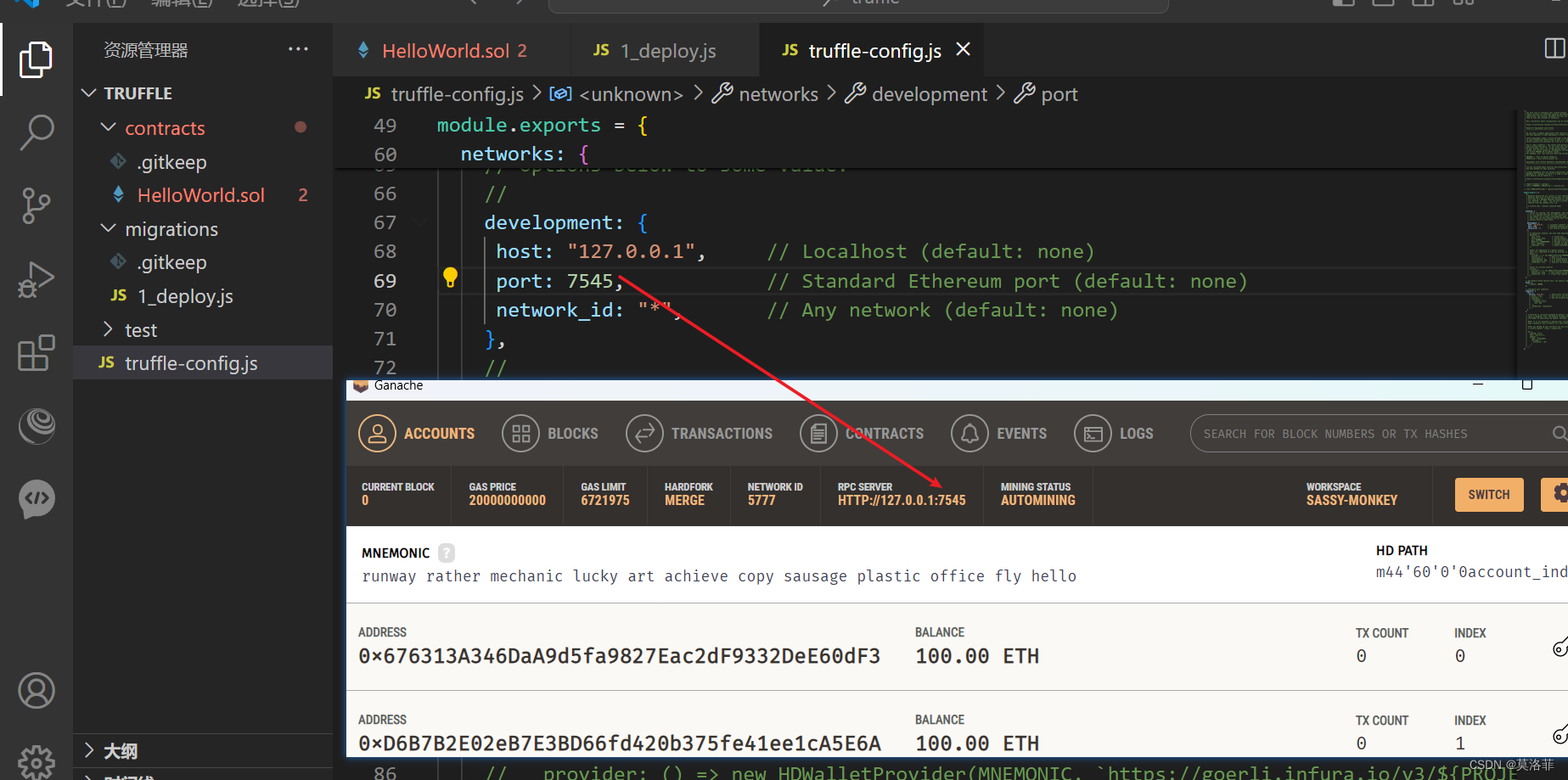 4.修改truffle-config.js 配置, 下面 的port对应也是本地Ganche