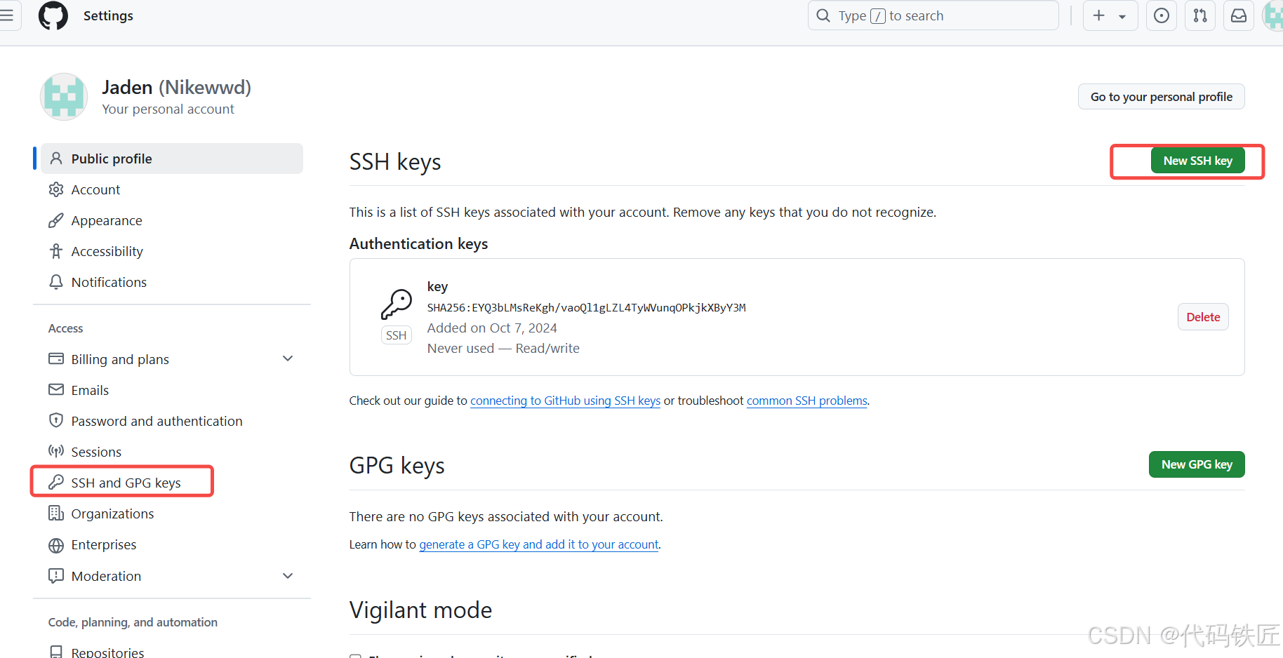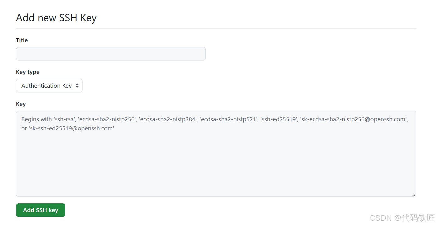 点击new SSH Key按钮创建秘钥,title是你给你的秘钥起一个标题,key里面就把你刚才复制的秘钥粘贴进去,点击add SSH KEY就可以了: