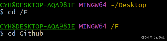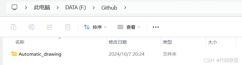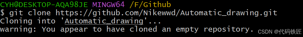 然后再打开Git Bash,将自己的文件存储定位在一个你代码所要存储的位置,在这里,我将定位在F盘当中,之后开始克隆一个仓库到本地:(gitclone后面的网址就是你之前创建的仓库的网址)之后打开你所定位的F盘,就会出现一个跟你远程仓库一样的仓库文件夹: