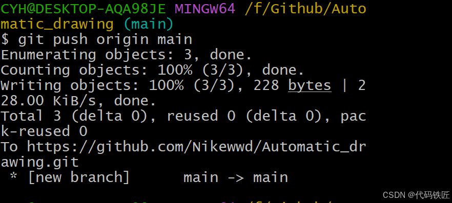 git push origin main提交到远程。中间要登陆,账号密码就是github的