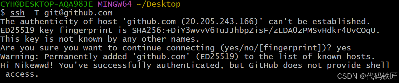 再回到Git Bash,输入命令:$ ssh -T git@github.com ,再输入yes, 出现如下界面,就说明链接成功了。