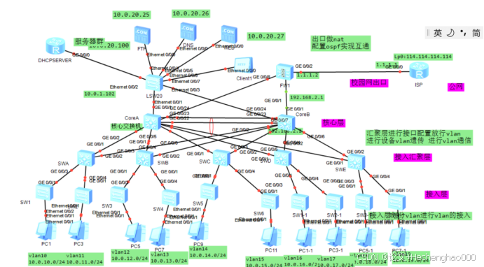 (4)核心层之上,核心路由器负责流量转发以及配置nat和做端口映射。