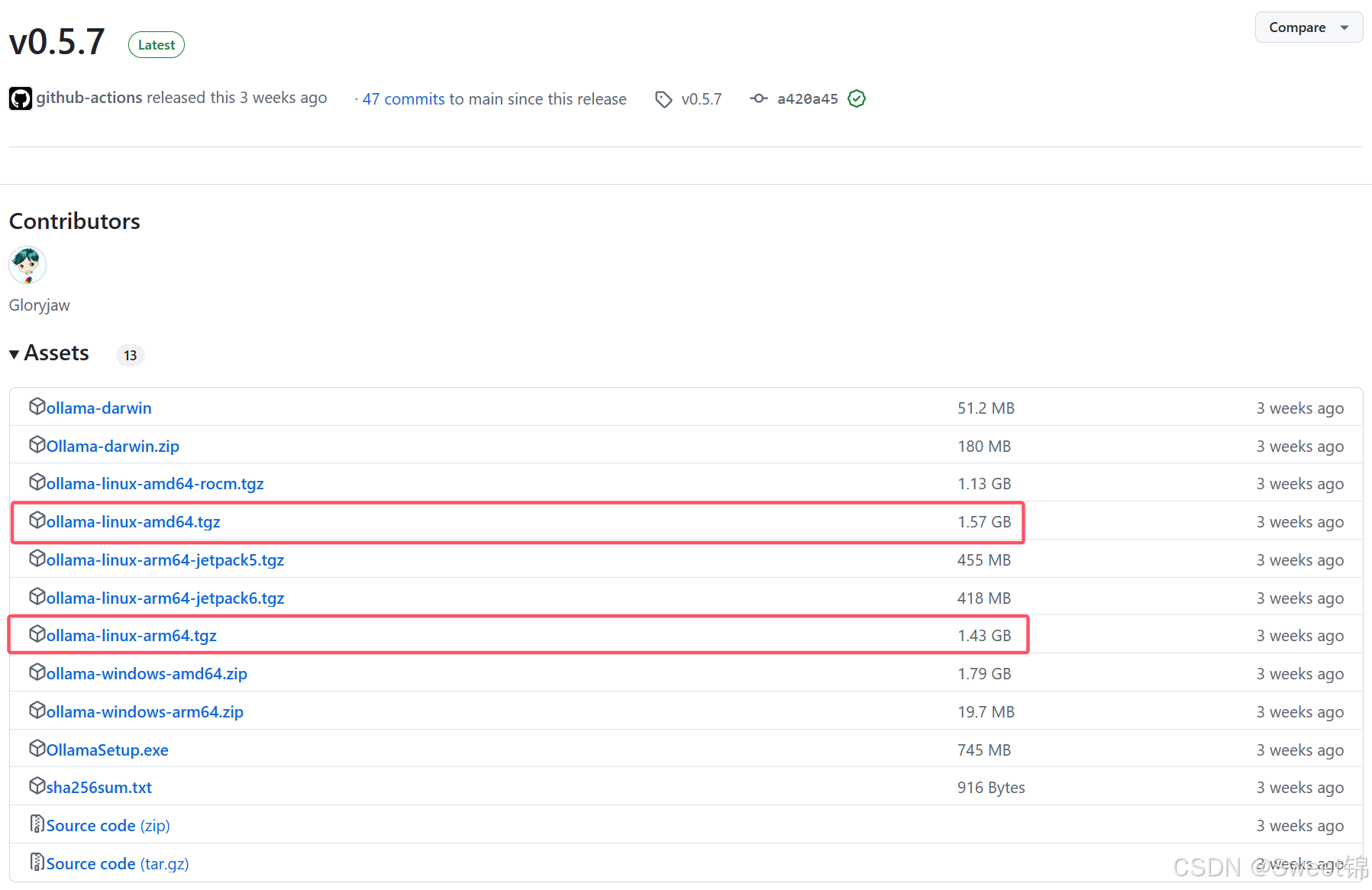 https://ollama.com/download/ollama-linux-arm64.tgz注:后两个链接看似是官网地址,实则最后都会跳转到Github下载,只不过会方便一些,它会自动定位到最新版本的安装包。