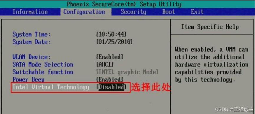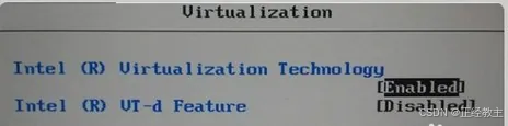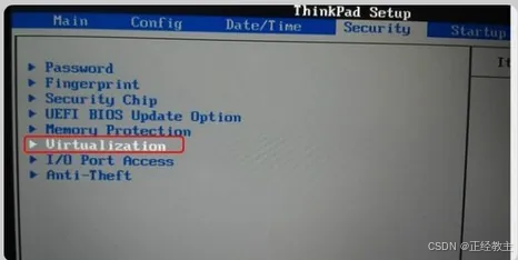 在BIOS菜单中,找到Configuration选项或者Security选项,然后选择Virtualization,或者Intel Virtual Technology,总而言之查找与虚拟化相关的选项: