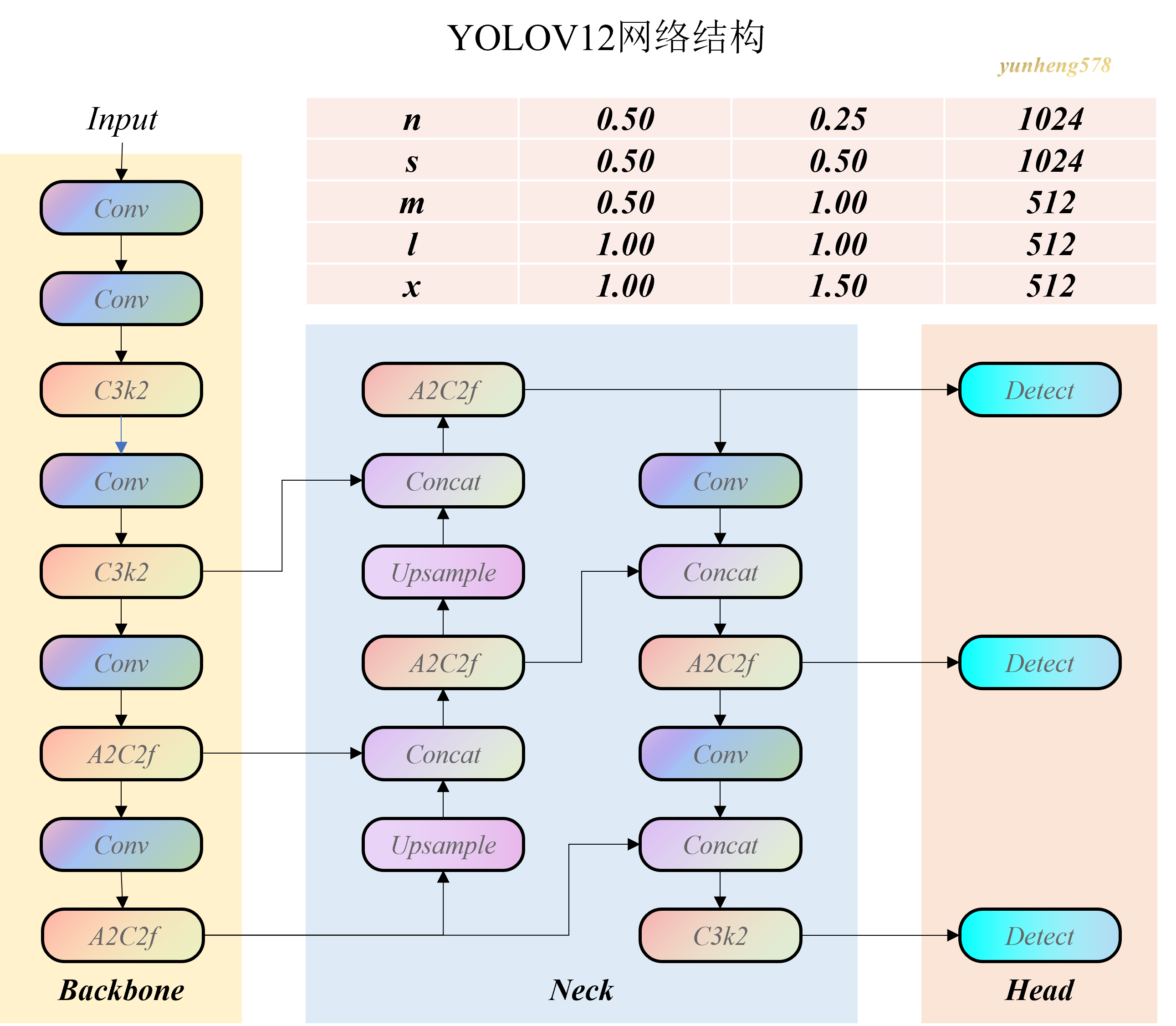 Backbone(主干网络):由Conv(卷积层)、C3k2 和 A2C2f 模块组成,C3k2是YOLO11中提出的模块,用于辅助特征提取,A2C2f 为YOLO12中首次提出的结构,用于特征提取,进一步处理和提炼特征。