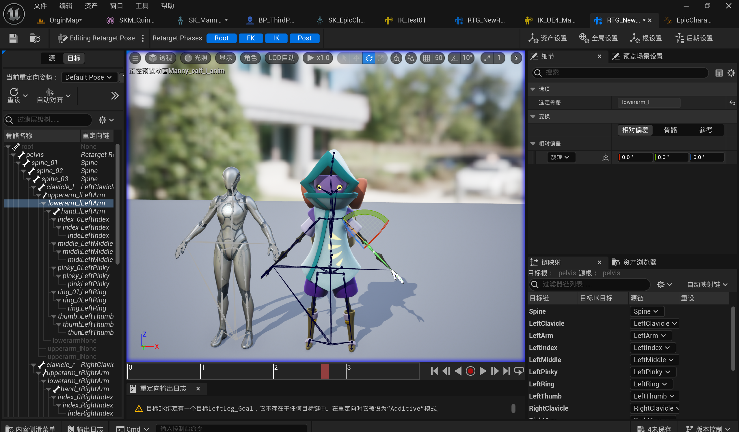 动画重定向需要使用两个骨架的IK绑定连接两个骨骼资产