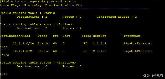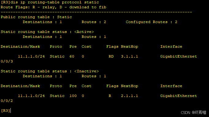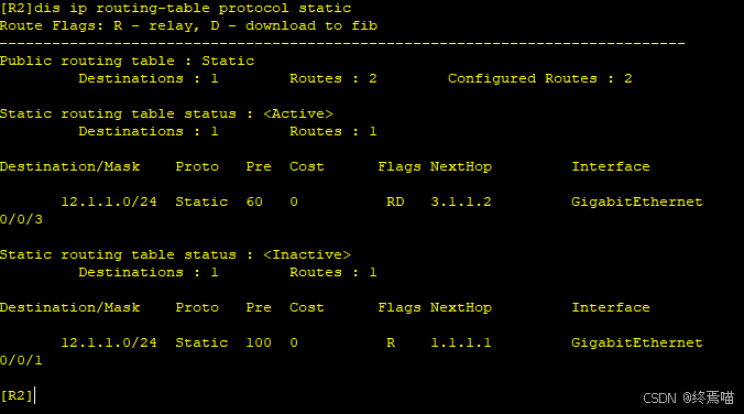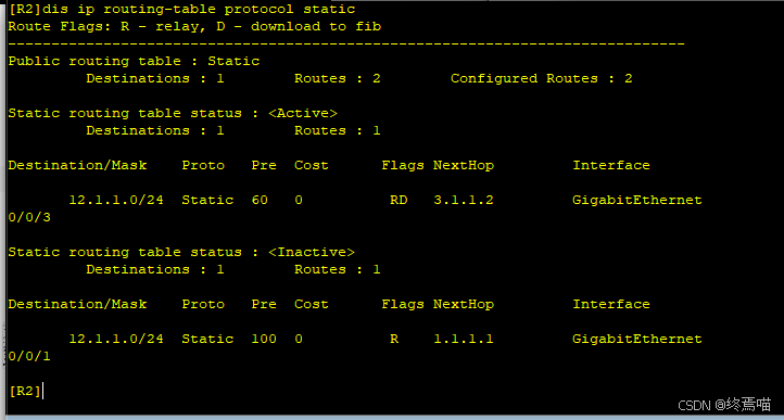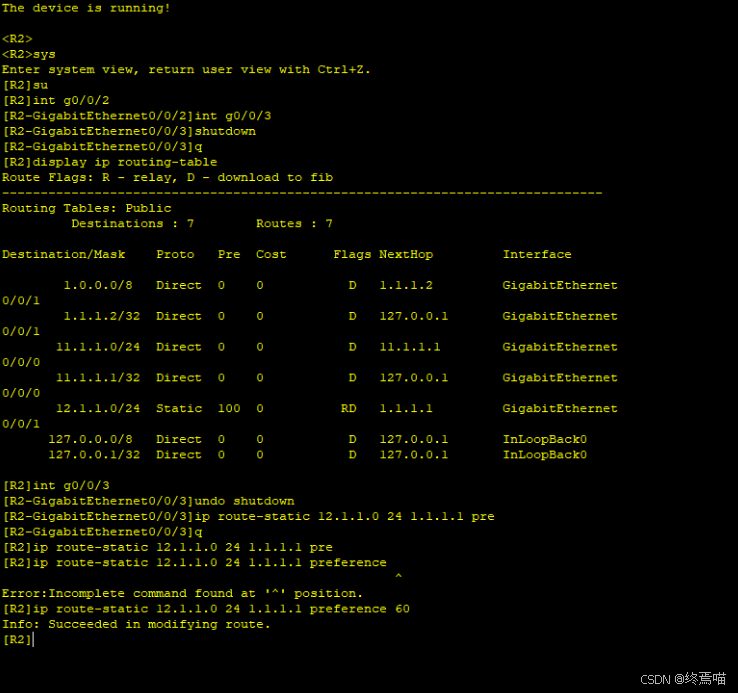 [R2]ip route-static 12.1.1.0 24 1.1.1.1 preference 60