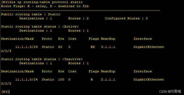 [R3]ip route static 11.1.1.0 24 2.1.1.1 prefenrence 100