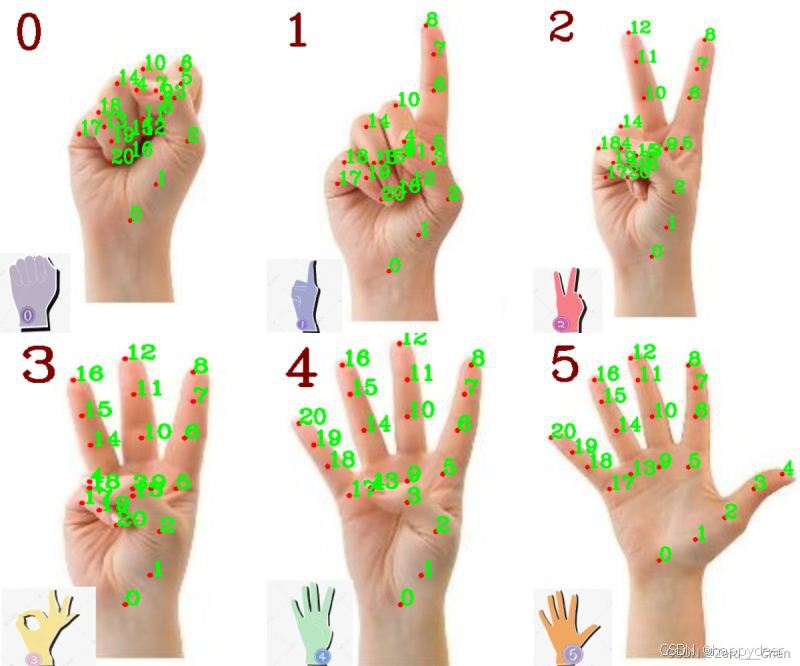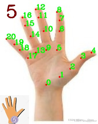 如图所示,我们已经通过DNN检测出21个手部关键点所在位置。接下来,我们需要使用这些关键点进行简单的手势识别。