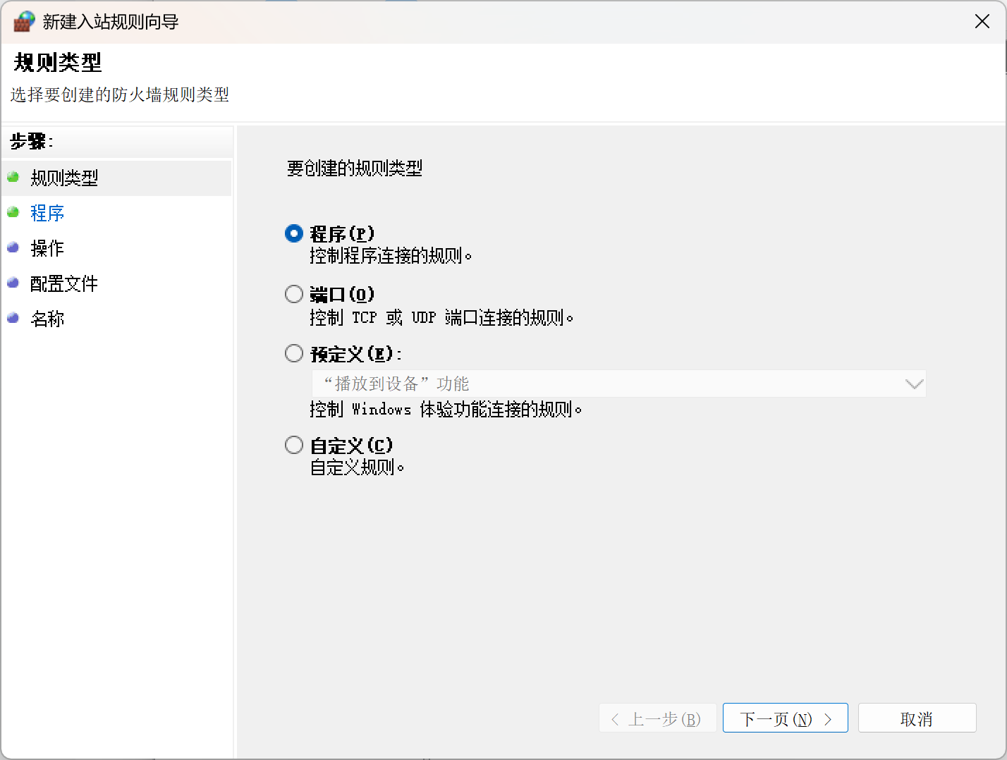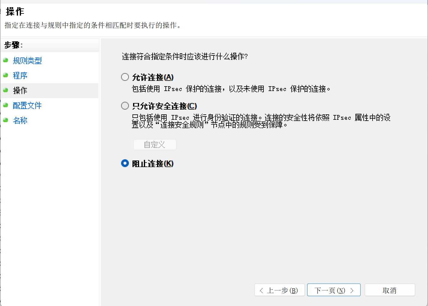 (6)选择好以后,点击“下一页”,选择“阻止连接”