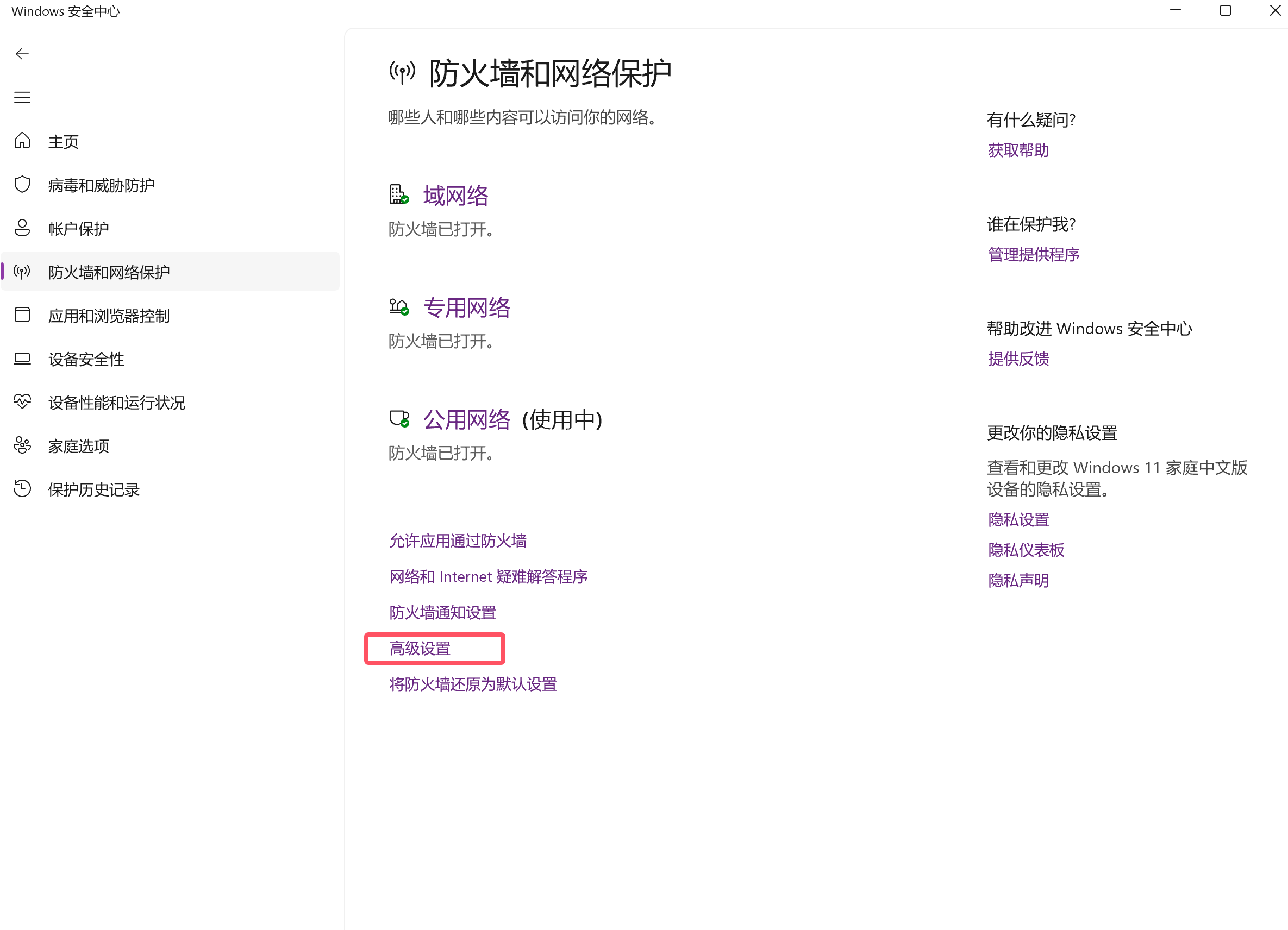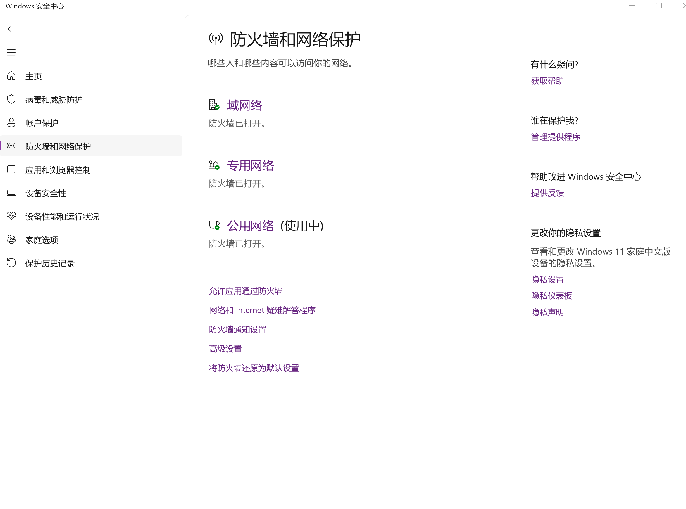(1)打开“Windows安全中心”——>“防火墙和网络保护”,如下图: