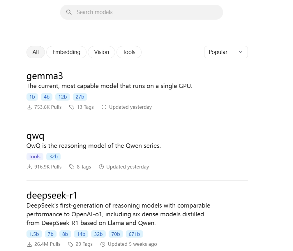 在ollama官网,有非常多的开源模型供我们选择,地址:https://ollama.com/search