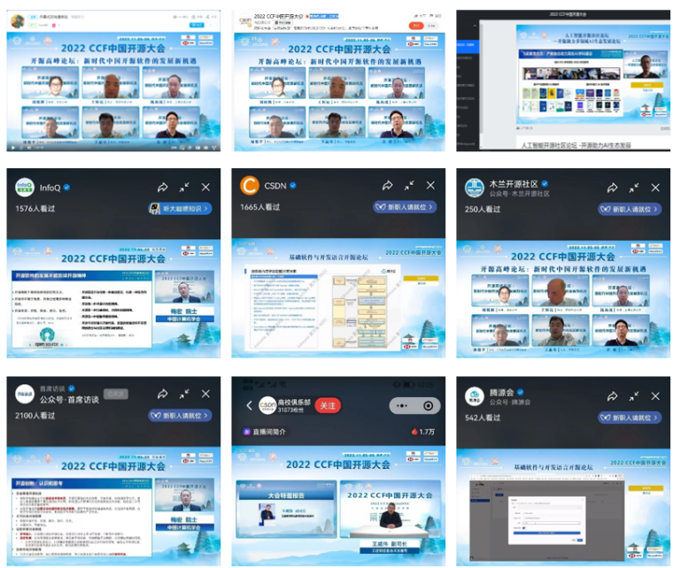 首届CCF中国开源大会(CCF ChinaOSC)于2022年11月5日至6日在陕西省西安市召开,主题为“开源创新、引领未来”。大会由中国计算机学会(CCF)与开放原子开源基金会主办,CCF开源发展委员会、西安电子科技大学承办,西安电子科技大学计算机科学与技术学院(国家示范性软件学院)具体落实,西安市智能软件工程重点实验室负责实施。大会组织特邀报告、开源高峰论坛、开源发展委员会路演、社区论坛、技术论坛、教育论坛、开源创新大赛培训等20余个不同类型的活动。大会邀请了10余位开源及相关领域中国科学院院士、中国工程院院士与知名专家,为大会带来特邀报告并参加开源高峰论坛等活动。大会采用线上方式进行,吸引了开源领域国内外相关领域师生与同行的广泛参与,两天会期累计观看人数超过34万人,单个论坛平均访问量超过1万人次,最大访问量超过2.1万人,有效的传播了开源理念,促进我国开源生态的发展。