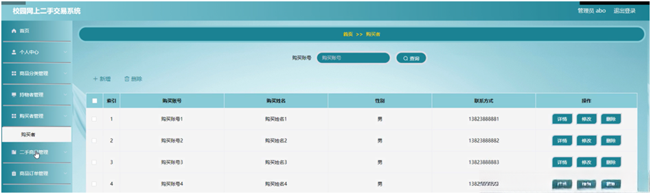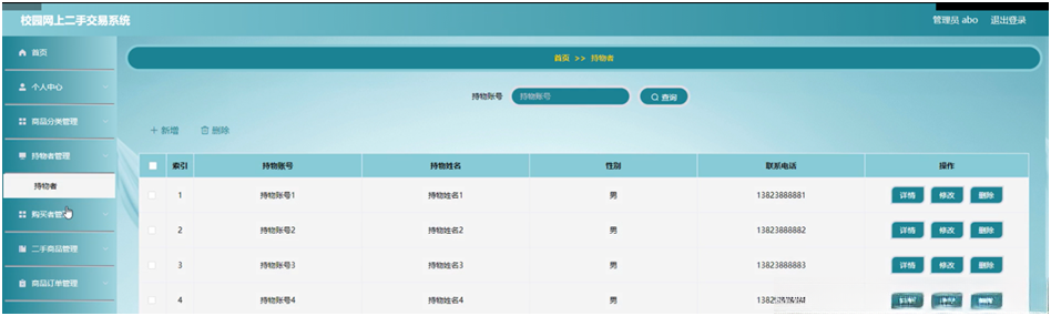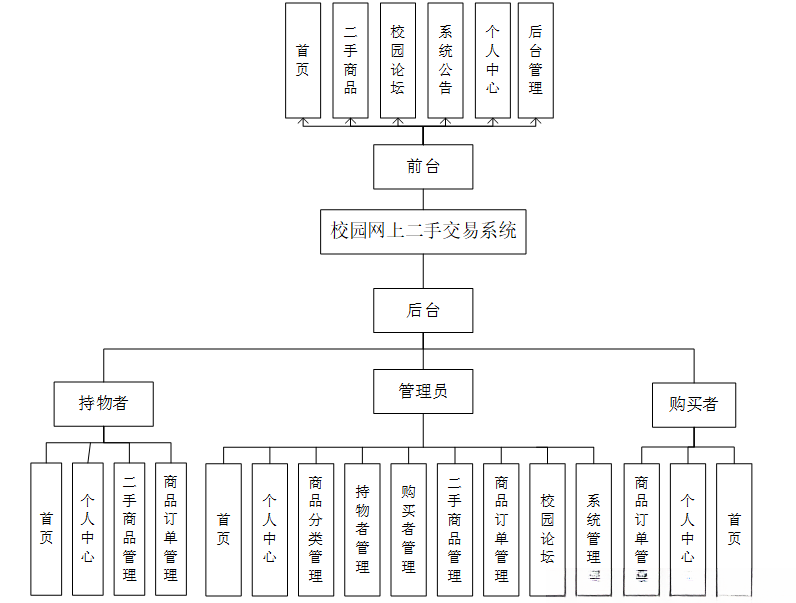 通过市场调研及咨询研究,了解了校园网上二手交易系统及管理者的使用需求,于是制定了管理员,持物者和购买者等模块。功能结构图如下所示: