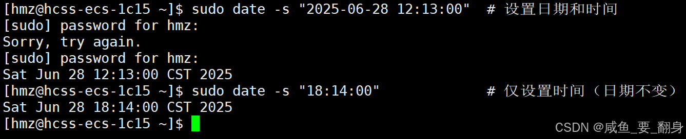sudo date -s "2025-06-28 12:13:00" # 设置日期和时间