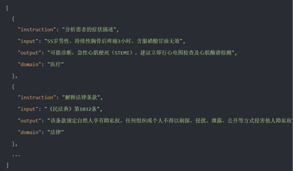 在特定领域的数据集上对模型进行训练,通常包含该领域的专业术语、特定格式和相关任务的标注。例如,在医疗领域,数据集可能包含病历文本、医学术语以及对应的诊断结果等信息。