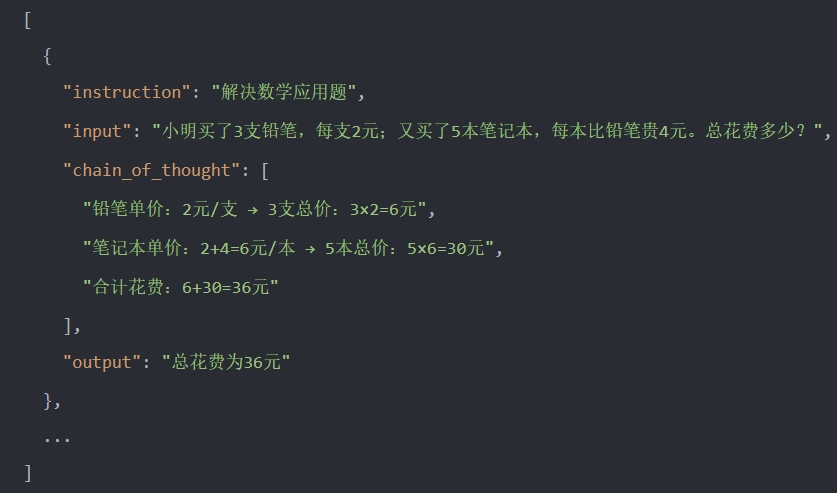 监督微调的一种特殊形式,通过在数据集中显式标注思维链(Chain of Thought, COT),训练模型不仅给出最终答案,还能生成逻辑推导过程。其核心在于让模型学会「分步思考」,适用于需要复杂逻辑推理的场景(如数学证明、代码调试)。