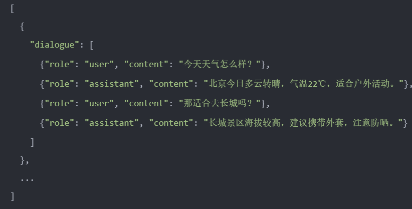 对话微调数据集的核心特点:包含多轮对话上下文、标注角色身份,注重回复连贯性与逻辑性。通过这样的数据,模型可以学习到在不同对话场景下如何生成合适的回复,从而提高对话的连贯性和相关性。