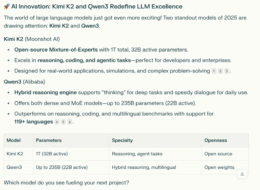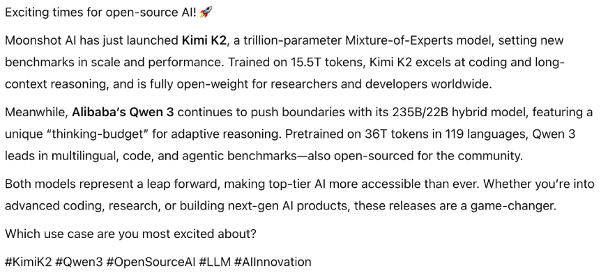 提示:“在领英上发布一篇帖子,讨论Kimi和Qwen的最新两款产品。”
