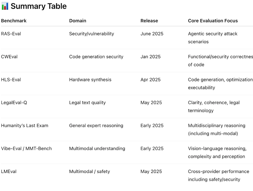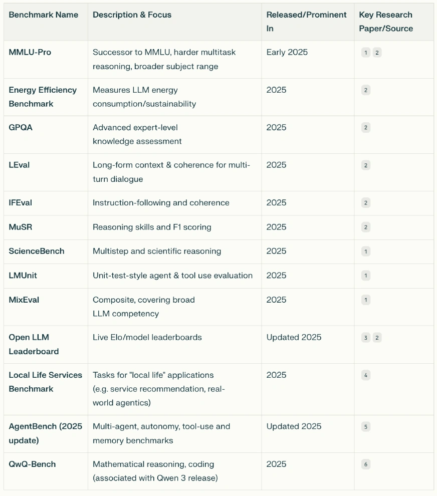 提示:列出2025年针对大型语言模型评估所发布的各项基准指标,并查找与这些基准指标相关的研究论文。