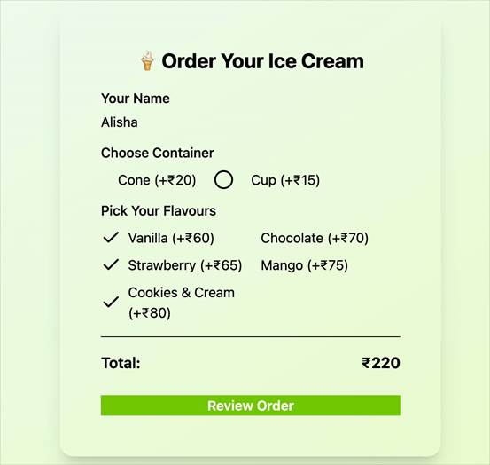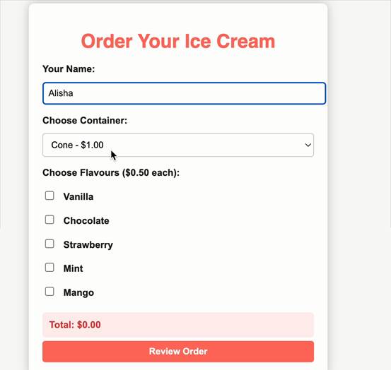 提示:“创建一个用户友好的冰淇淋订单网页。该网页应允许每位用户输入其姓名,选择圆锥形或杯装的容器,并选择一种或多种冰淇淋口味进行添加。在用户构建订单的过程中,显示当前总价;提交前,清晰展示所选内容概要及最终价格,供用户下单前对订单进行审查。”