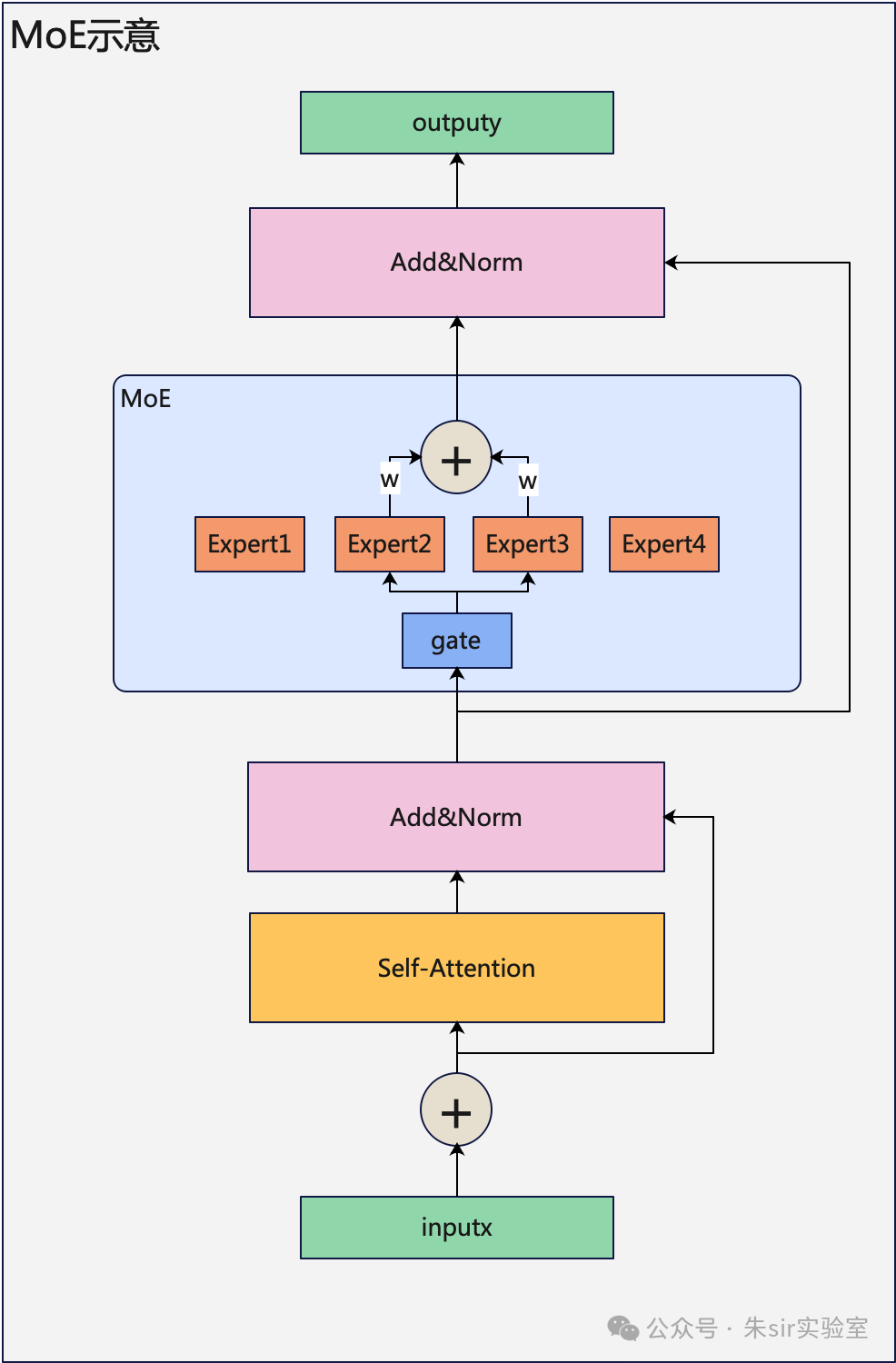 MoE通常位于注意力层之后,由多个独立神经网络(Experts)和一个门控网络(Gate)组成。 MoE的主要组成部分包括: