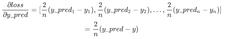 求损失函数关于 y_pred 的梯度(即偏导数组成的向量)。由于 loss 是 y_pred 的函数,我们需要对每个求偏导数,并将它们组合成一个向量。