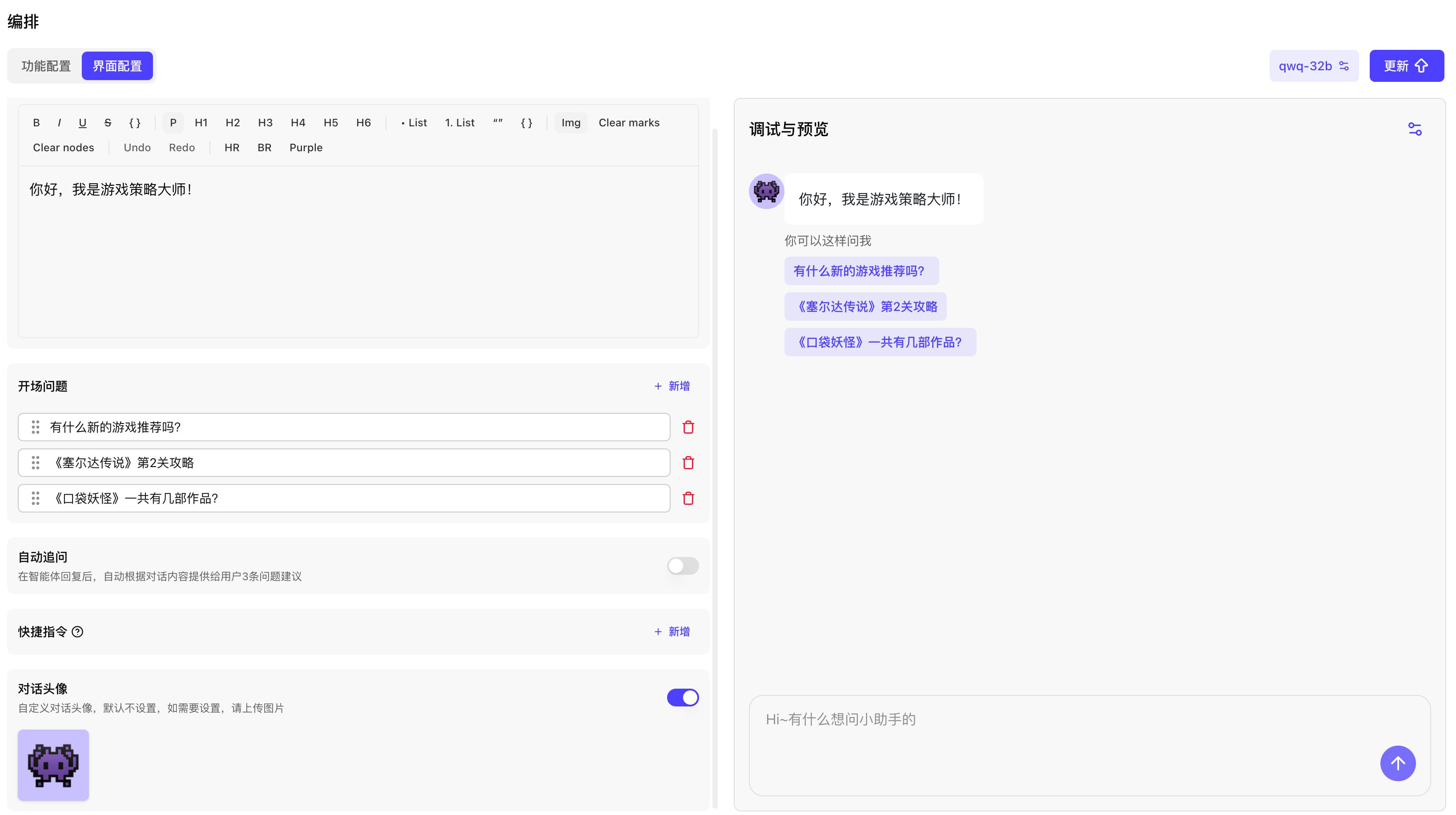 在FastbuildAI 中,你可以给智能体界面进行定制,例如开场白、预设问题、快捷指令等。