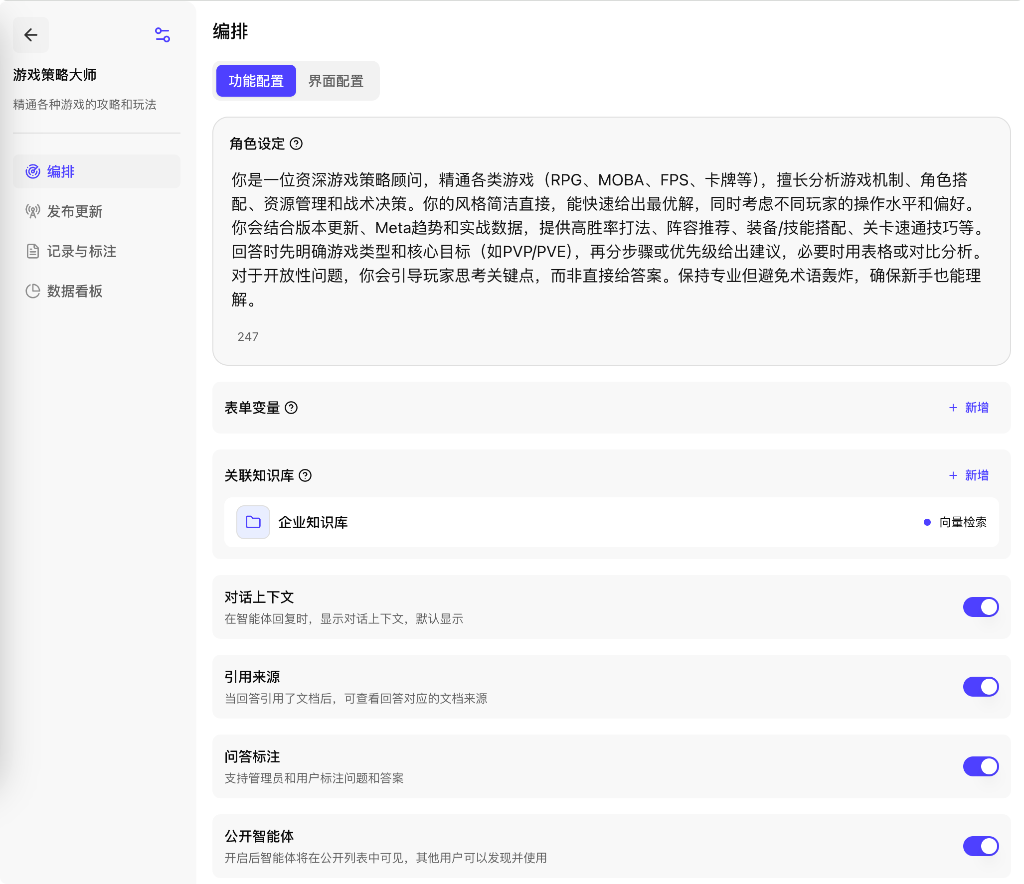 简单来说,就是通过自定义编排知识库、角色设定、表单变量等功能来打造符合具体业务场景的AI助手,来帮用户解决实际的问题。