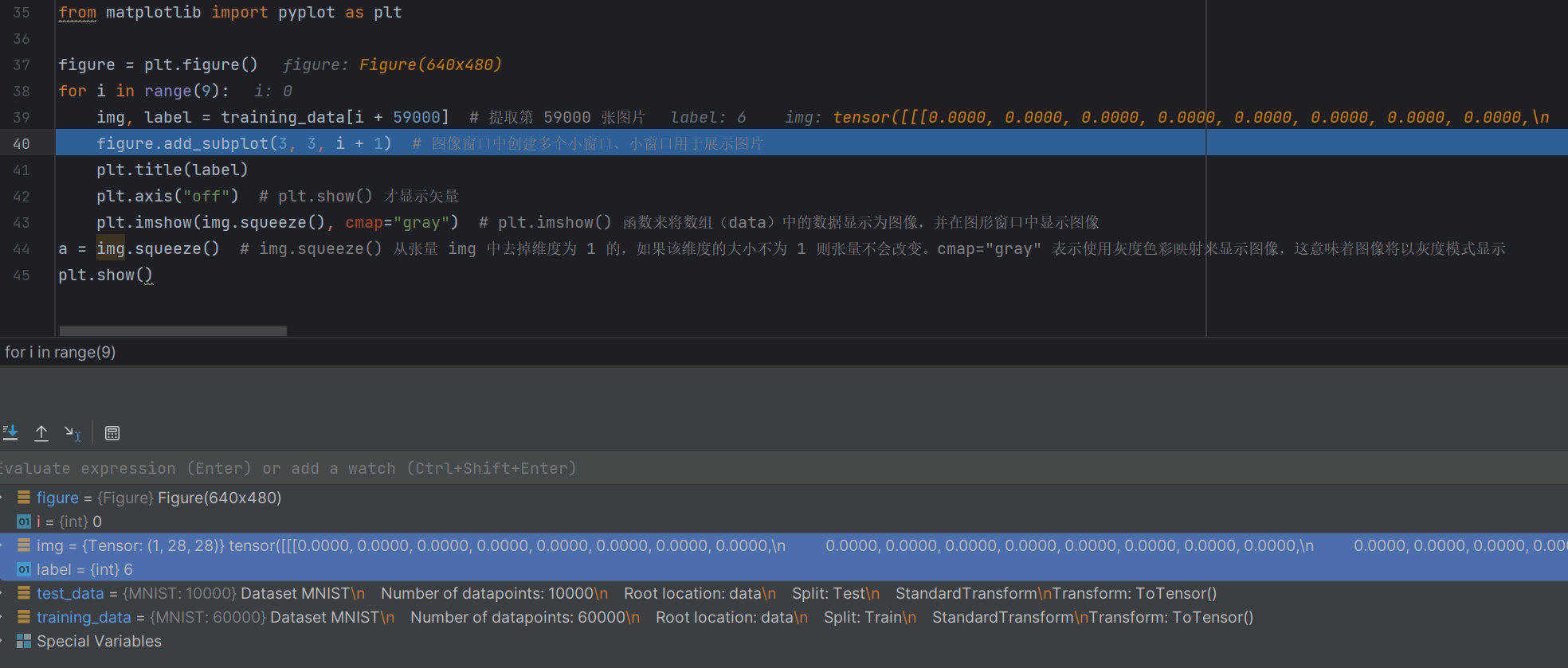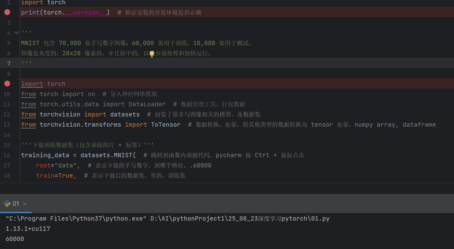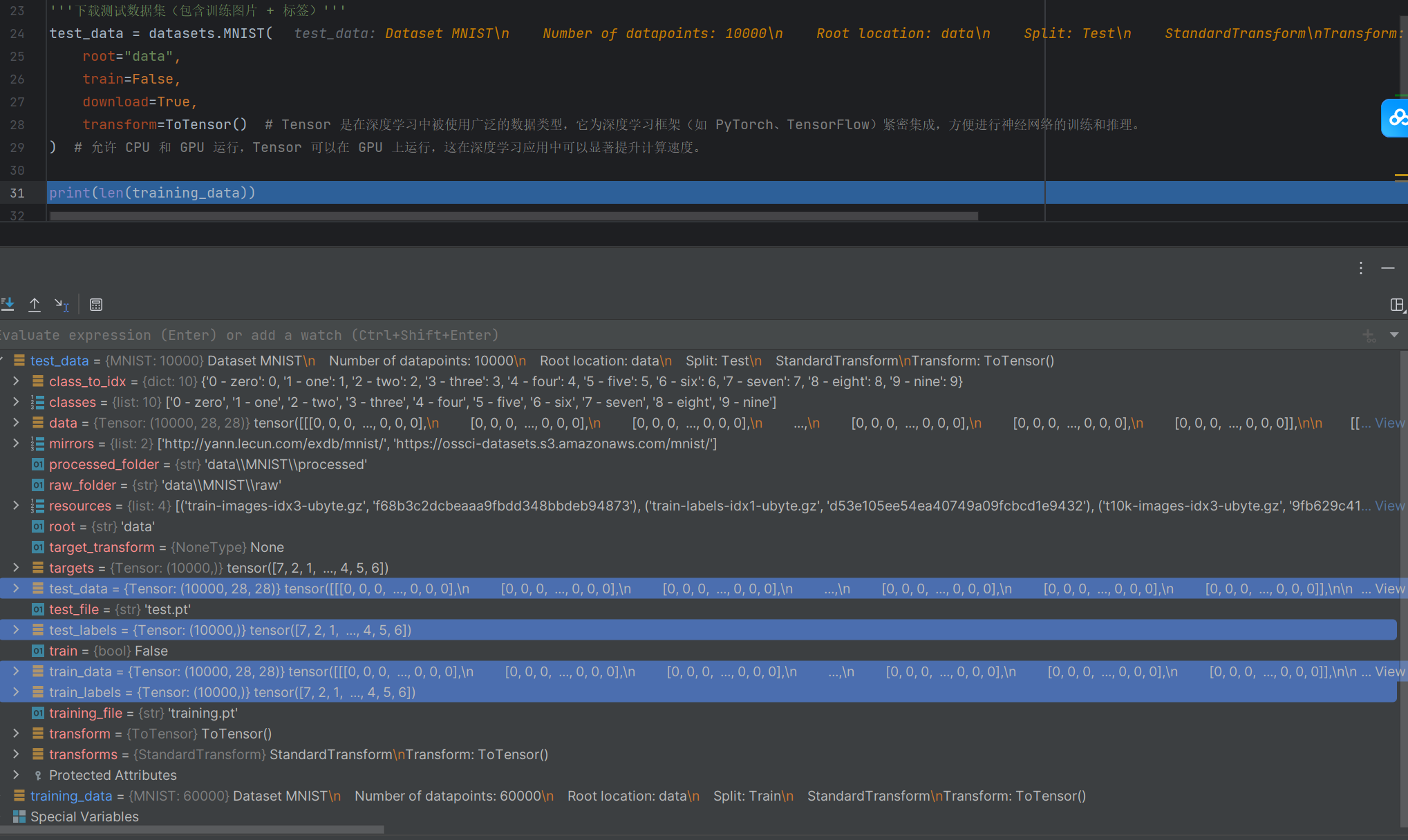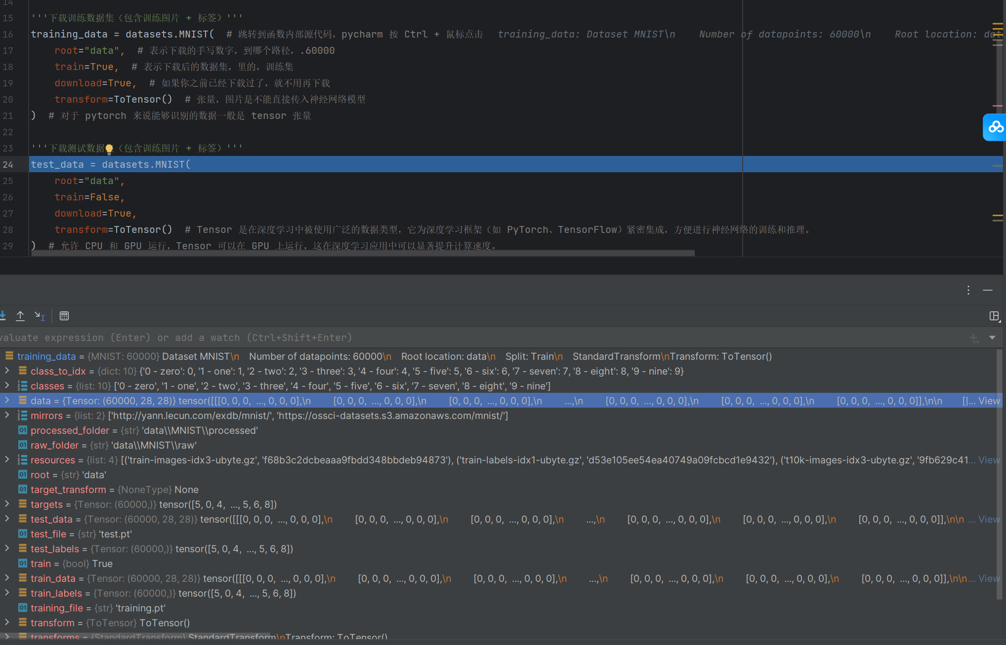 training_data = datasets.MNIST( # 跳转到函数内部源代码,pycharm 按 Ctrl + 鼠标点击
