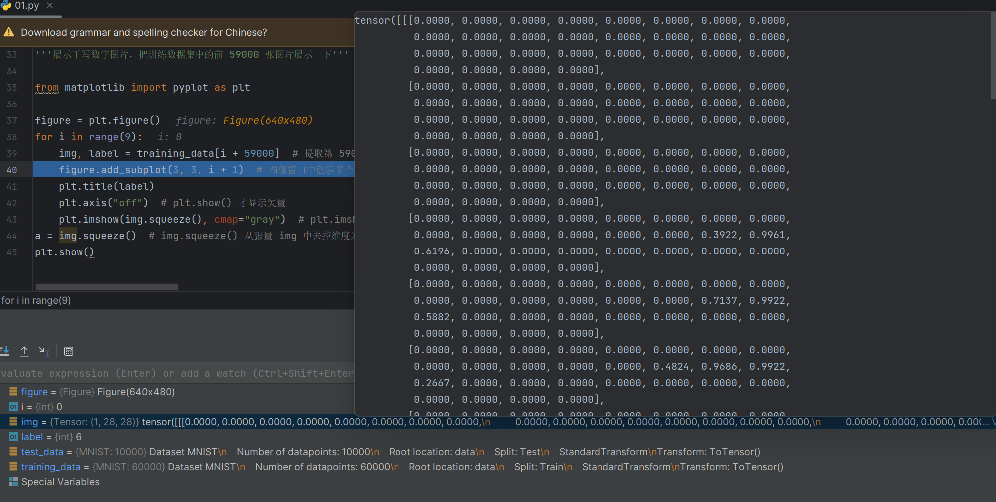 transform=ToTensor() # Tensor 是在深度学习中被使用广泛的数据类型,它为深度学习框架(如 PyTorch、TensorFlow)紧密集成,方便进行神经网络的训练和推理。