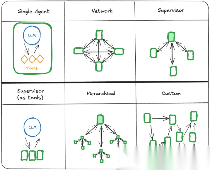 - • 监督者(工具调用):这是 监督者架构的特例。单个智能体可以表示为工具。在这种情况下,监督者智能体使用工具调用 LLM 来决定要调用哪些智能体工具,以及要传递给这些智能体的参数。