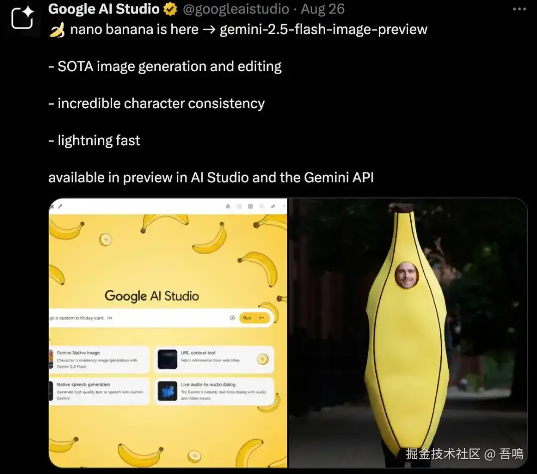 Google于2025年08月26日发布了一款图像生成模型,代号“纳米香蕉”,学术名称叫“Gemini 2.5 Flash Image”。由 Google AI Studio 推出,具备角色一致性保持、自然语言精准修图、多图融合等核心功能。