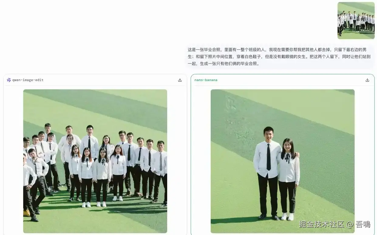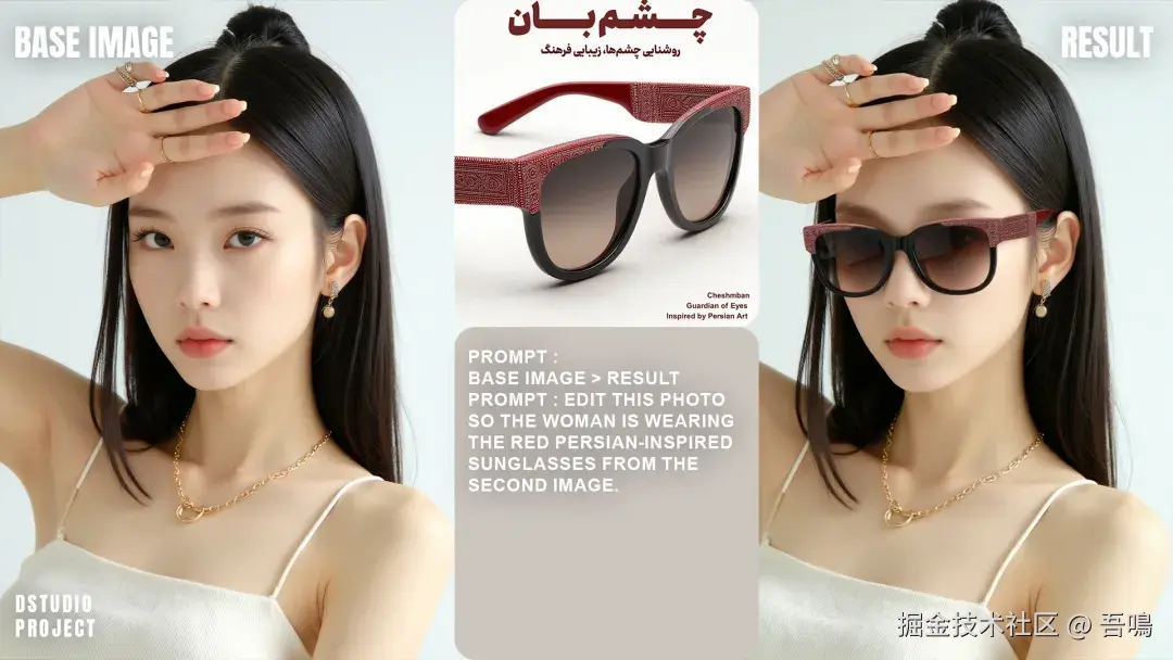 比如有一个美女模特,商品是一个墨镜,你和Nano Banana说:”让第一张图片的模特戴上第二张图片中的墨镜“,看看产生的图片效果。