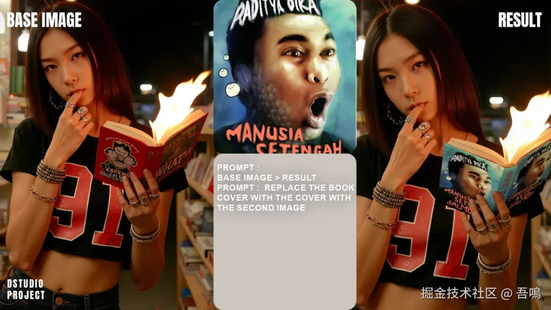 再比如,有个美女捧着一本书,你对Nano Banana说”把第一张图片中美女手中的图书的封面换成第二张图的封面“,看看效果。
