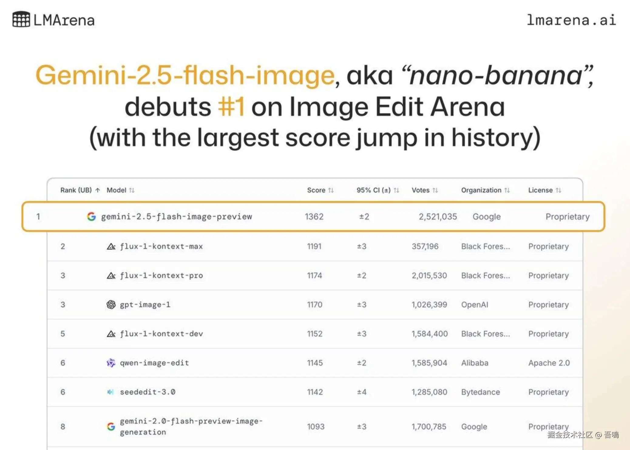 因为它能出色的理解用户意图、生成的图片非常地贴合用户所想,所以在发布短短的一两天时间里就开始迅速地火了起来,并在 LMArena 的AI图像编辑模型基准测试中超越了Flux-Kontext 和 GPT-image 直接登上了榜首。