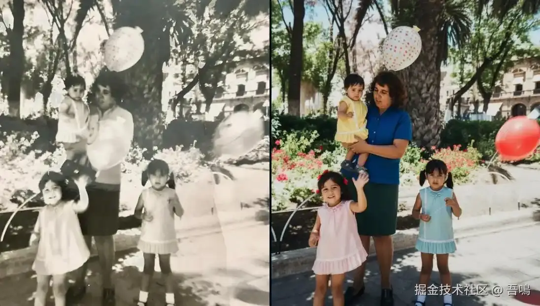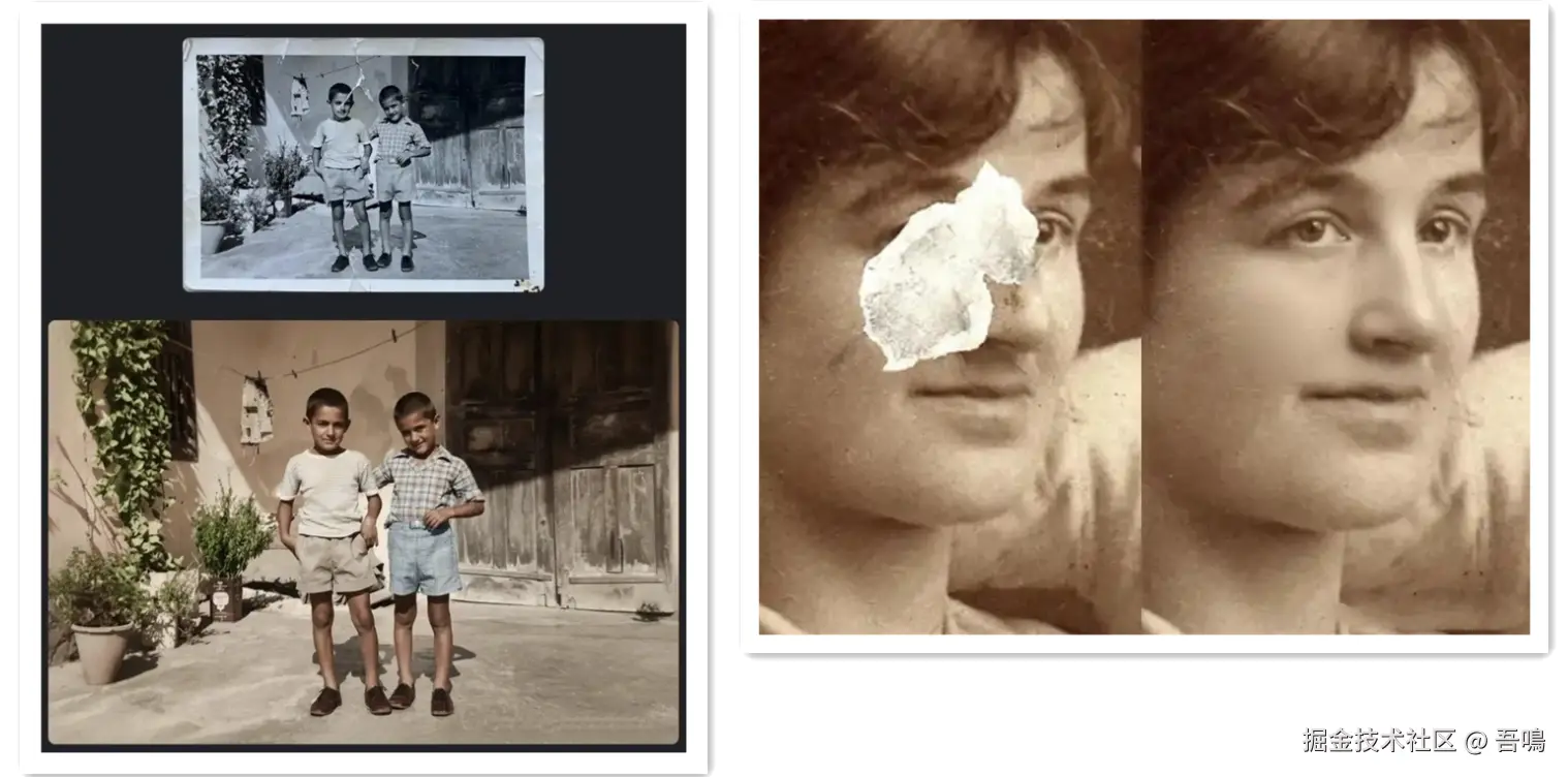 老照片的修复能力也是很不错的,无论是破损的图片,还是掉色的图片,你丢给它,叫它帮你修复破损的照片,或者是把褪色的图片重新上色,它都能帮你处理的不错。
