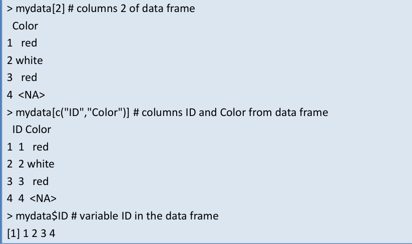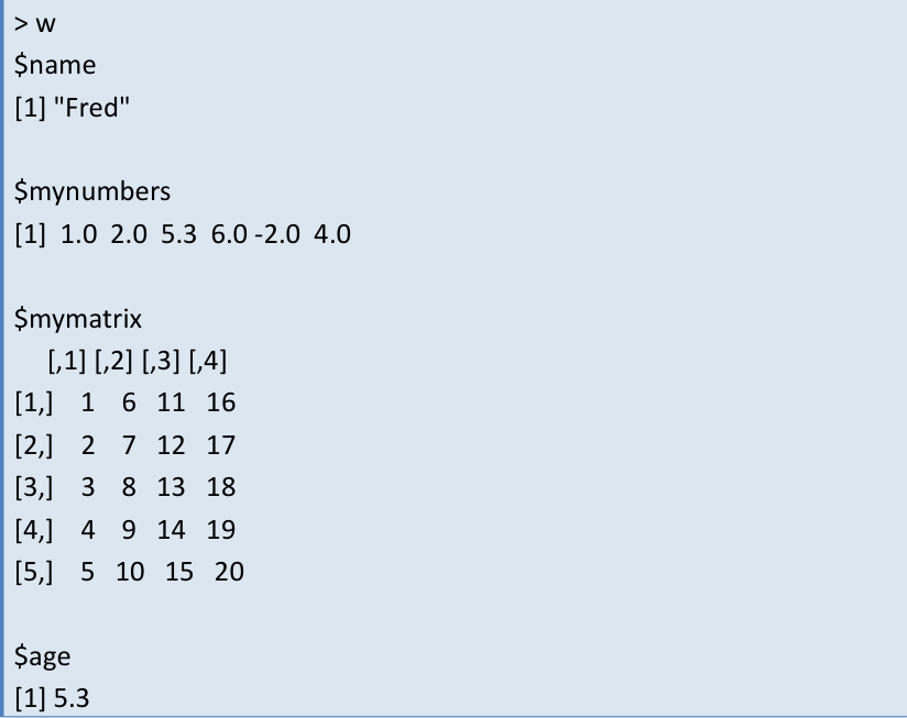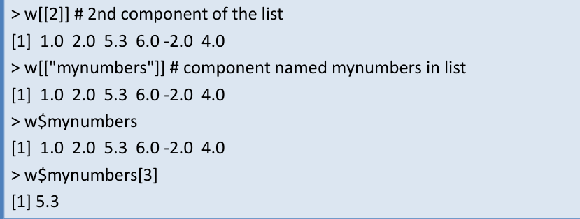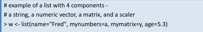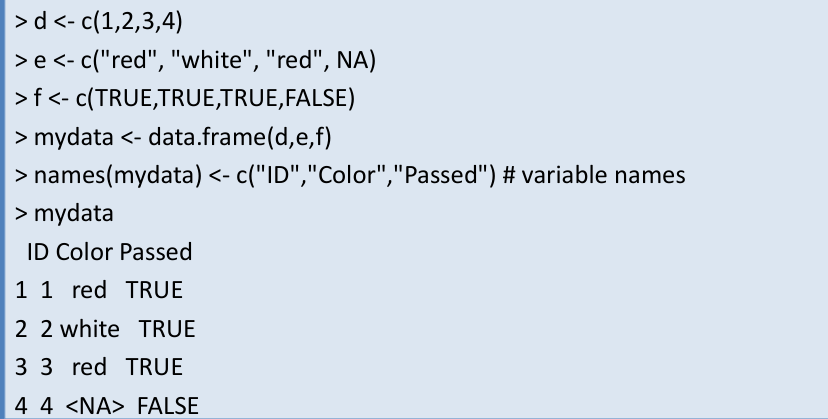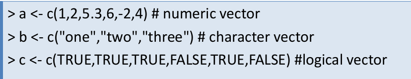 c(1,2,5.3,6,-2,4)、c("one","two")、c(TRUE,FALSE)。 -