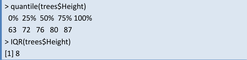 • IQR(x) = quantile(x, 3/4) - quantile(x, 1/4)(注:IQR即四分位距,是描述数据离散程度的统计量,计算公式为第三四分位数与第一四分位数之差)