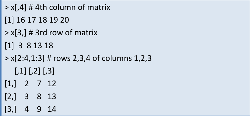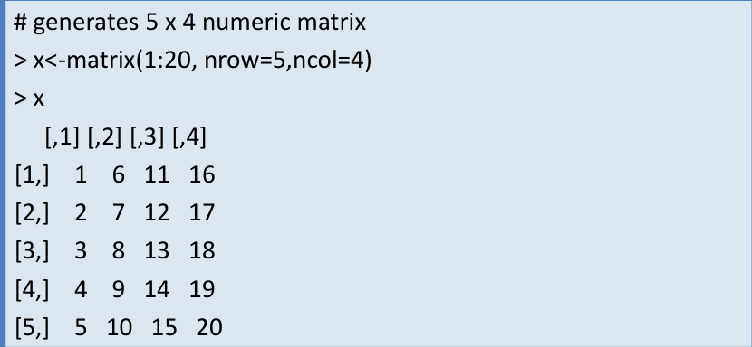 Matrix name<-matrix(vector, nrow=r, ncol=c)
