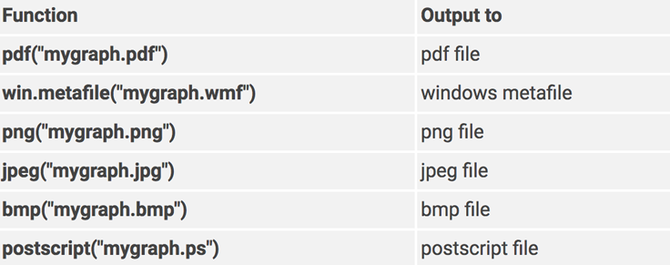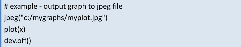 jpeg("c:/mygraphs/myplot.jpg") plot(trees$Girth, trees$Height) dev.off() # 关闭图形设备,文件写入完成