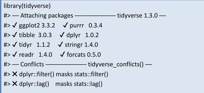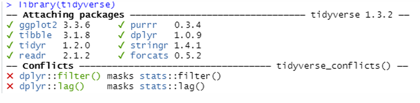 ggplot2/dplyr/tidyr/readr/purrr/stringr/forcats;加载时会显示与stats的函数命名冲突提示(例如filter、lag)。