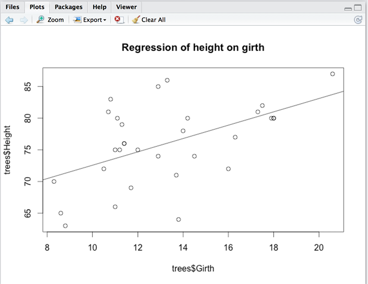 plot() 函数会打开一个图形窗口并绘制树高与树围的散点图。