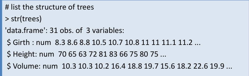str(trees)查看结构(行数、列数、类型、示例值); -
