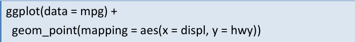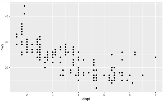 ggplot(data = mpg) + geom_point(mapping = aes(x = displ, y = hwy))
