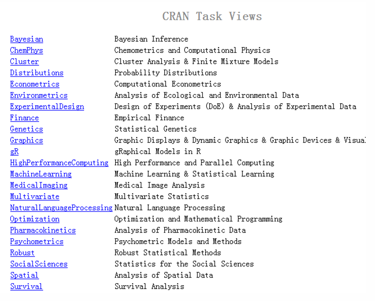 CRAN Task Views:官方按领域分类的包清单/导览页面(金融视图示例)。优先从 Task View 找权威包与替代方案。